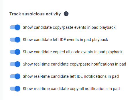You’ll be able to see notifications on the playback mode screen when a candidate has copy/pasted code, if they’ve copied all the code from a file, or if they left the IDE.