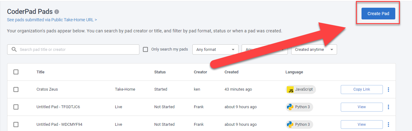 In your Interview dashboard, navigate to your Pads List and select Create Pad.