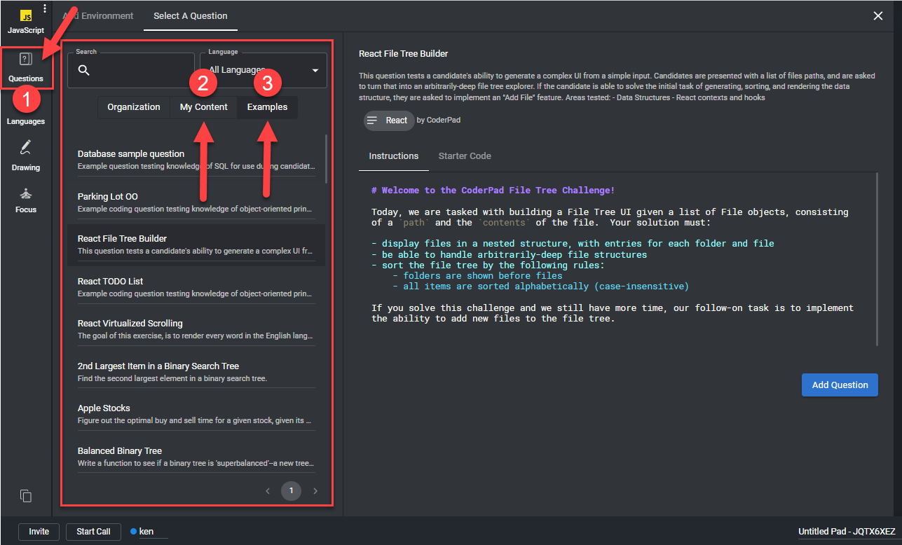 On the left nav menu, you can click on Questions to pull up your list of questions (1); from there you can select a framework question that you previously created (2) and it will populate the pad. You can also choose a question from the Examples questions list (3).