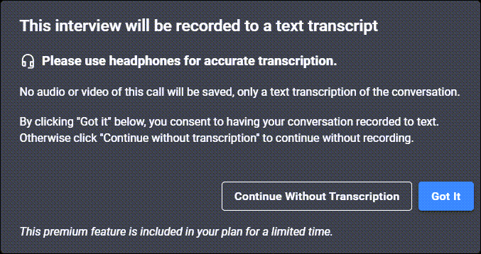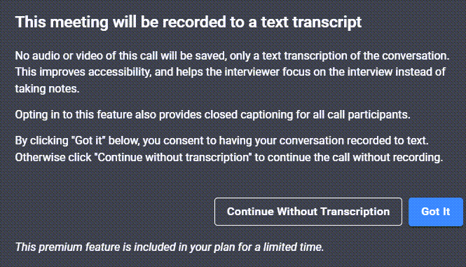 The candidate will be informed at the time they join the call that the call will be recorded to transcript only (no audio/video will be stored). They can agree to be transcribed or opt-out and join the call normally.