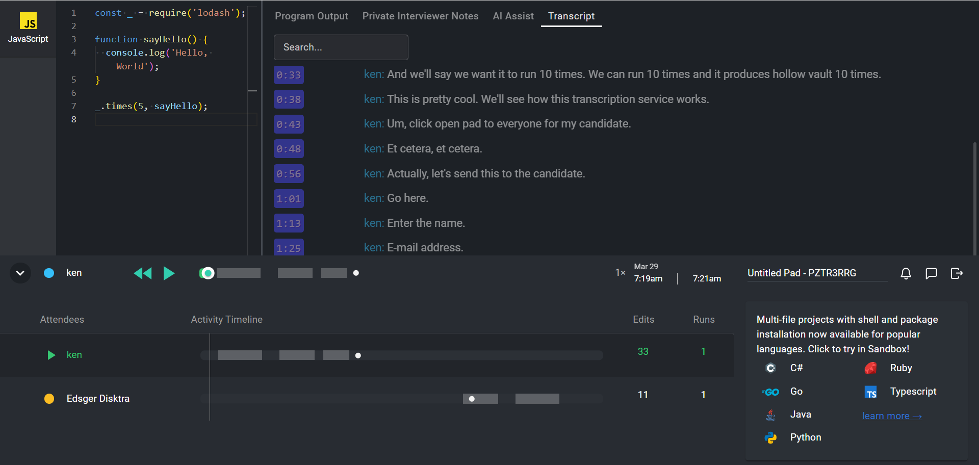 The transcript is connected to the playback bar at the bottom of the screen. You can click on any line in the transcript and it will take you to that spot in the playback so you can see what coding was happening at that point in time.