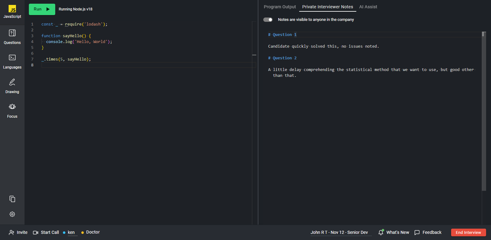 You can also input code into the interviewer notes section using Markdown. Here’s a Markdown example of how to write a JavaScript code block: