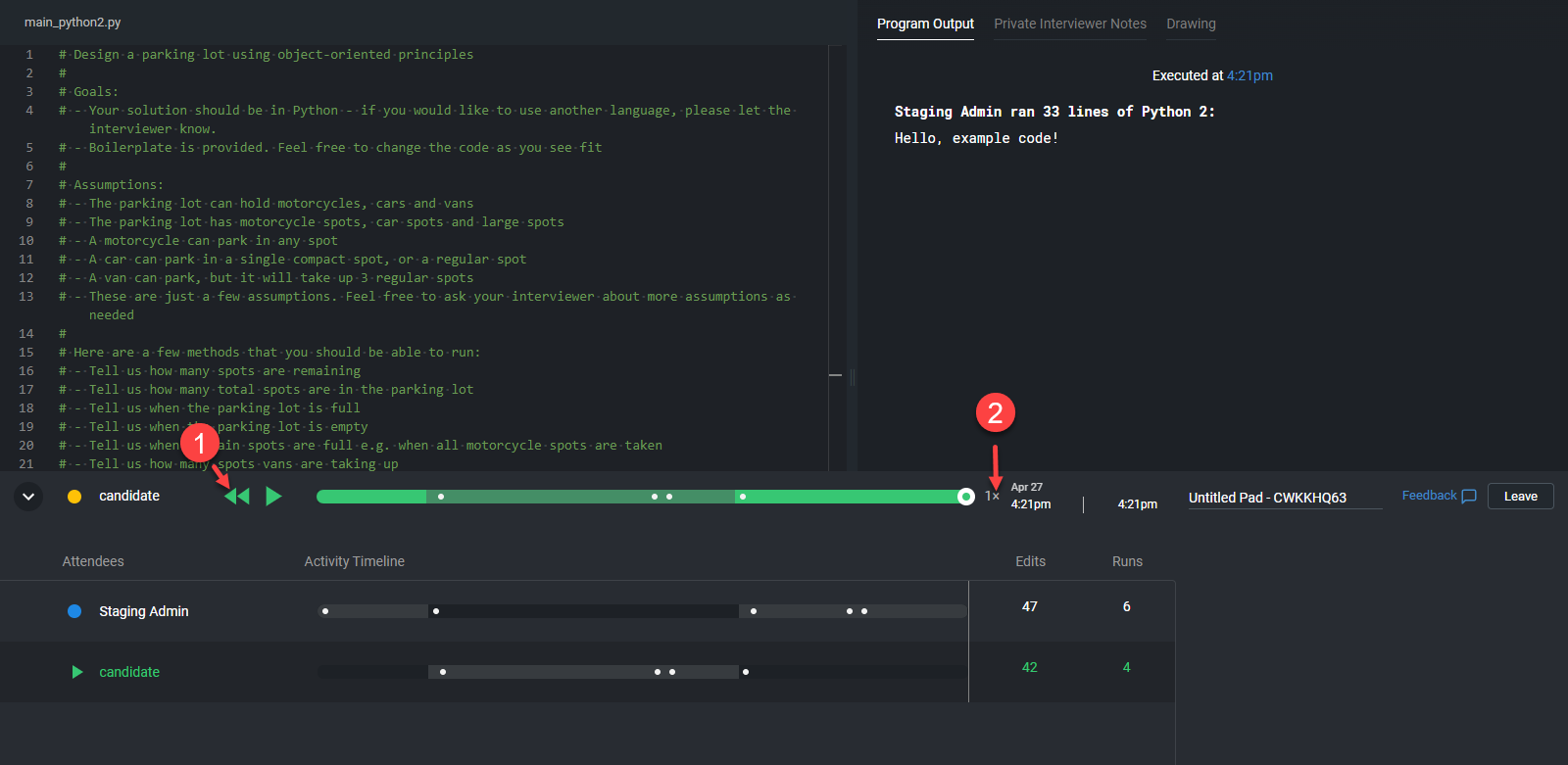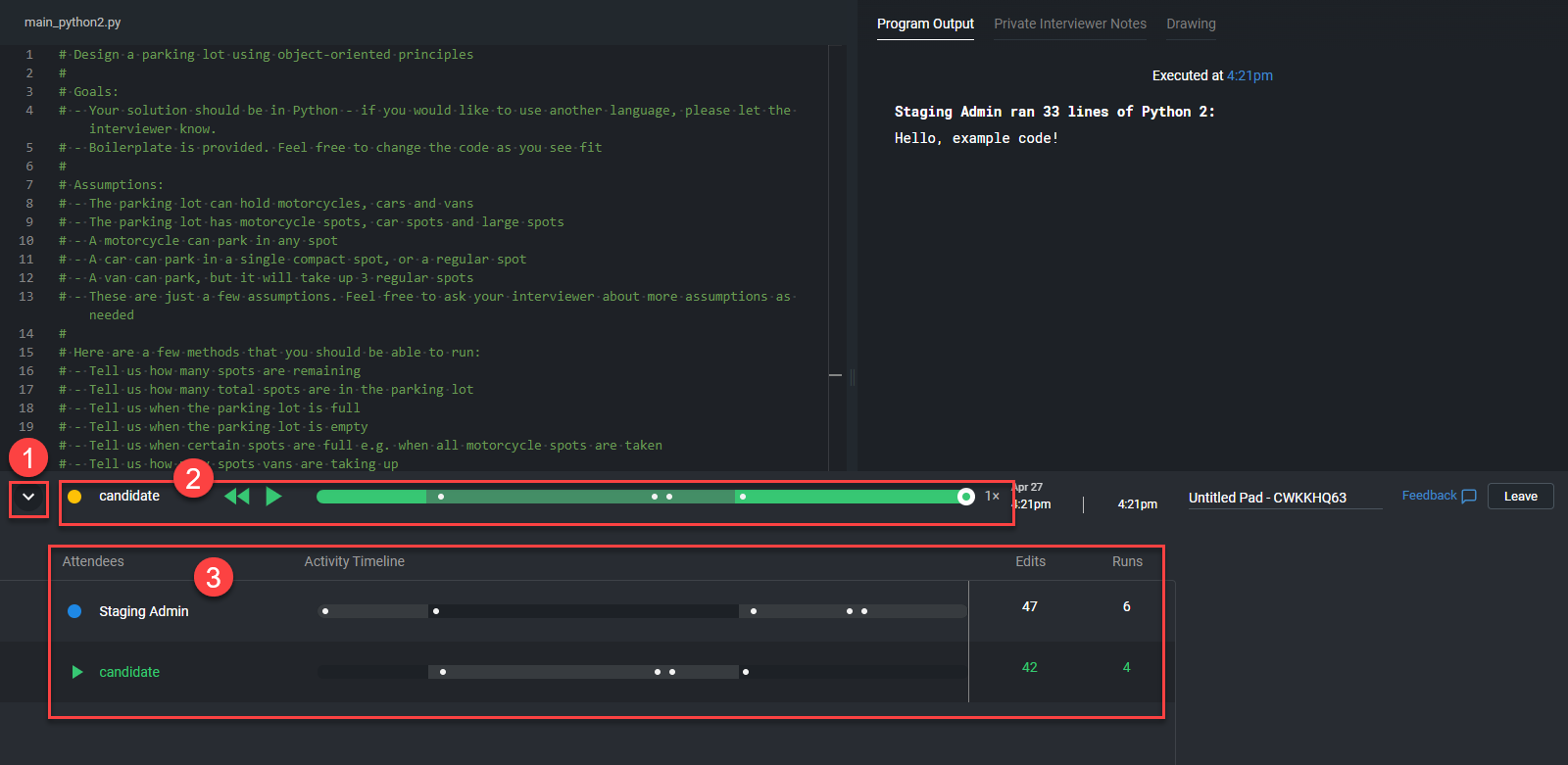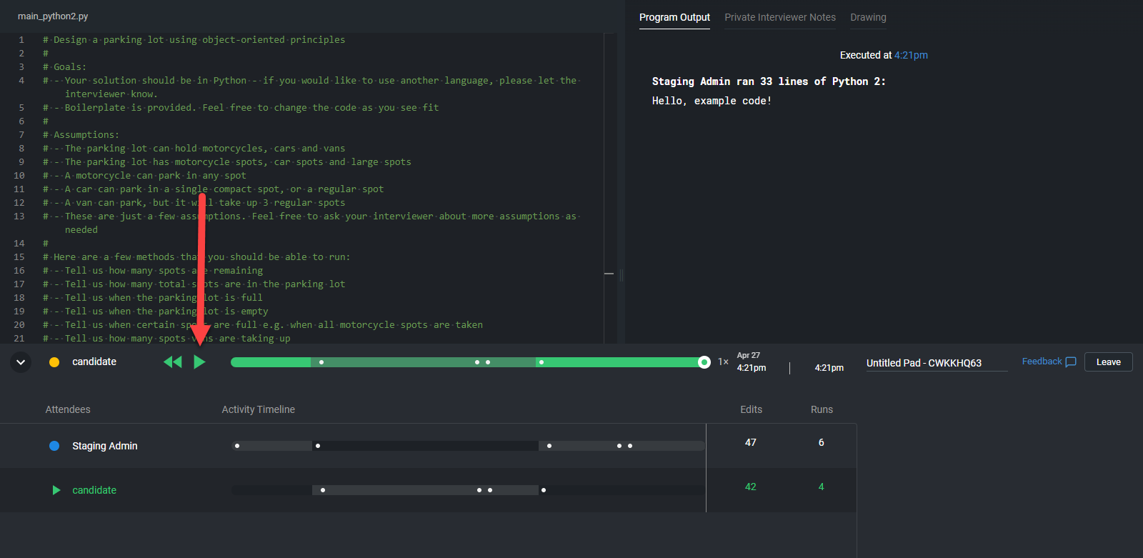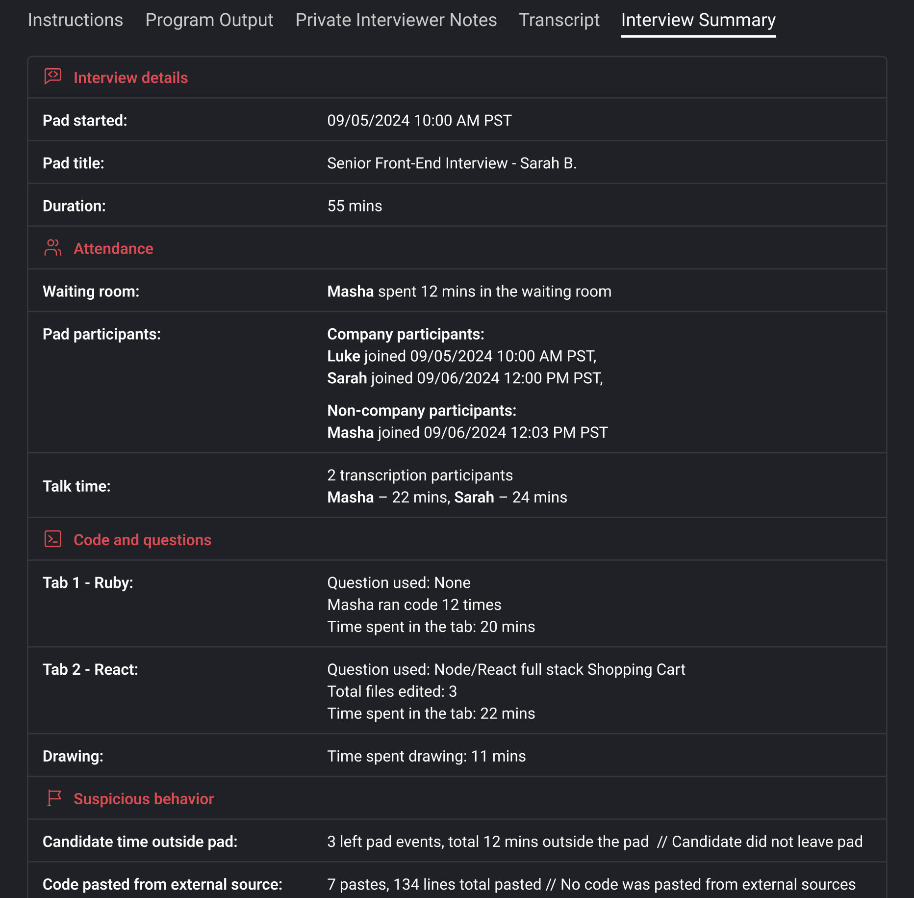 Once the interview has been ended, interviewers can replay the entire interview and access the pad summary. This is useful to review a candidate’s solution, write up feedback and also to share the interview session with other teammates.