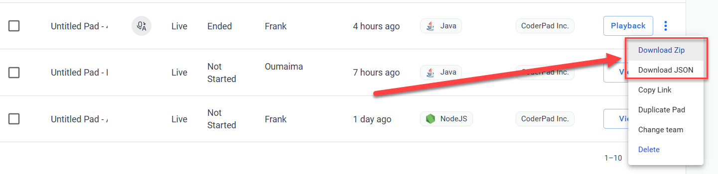 Want to share results with team members not on CoderPad? You can download the candidate’s code either as a .zip. or .json file by clicking on the kebab icon next to the pad and selecting Download ZIP or Download JSON.
