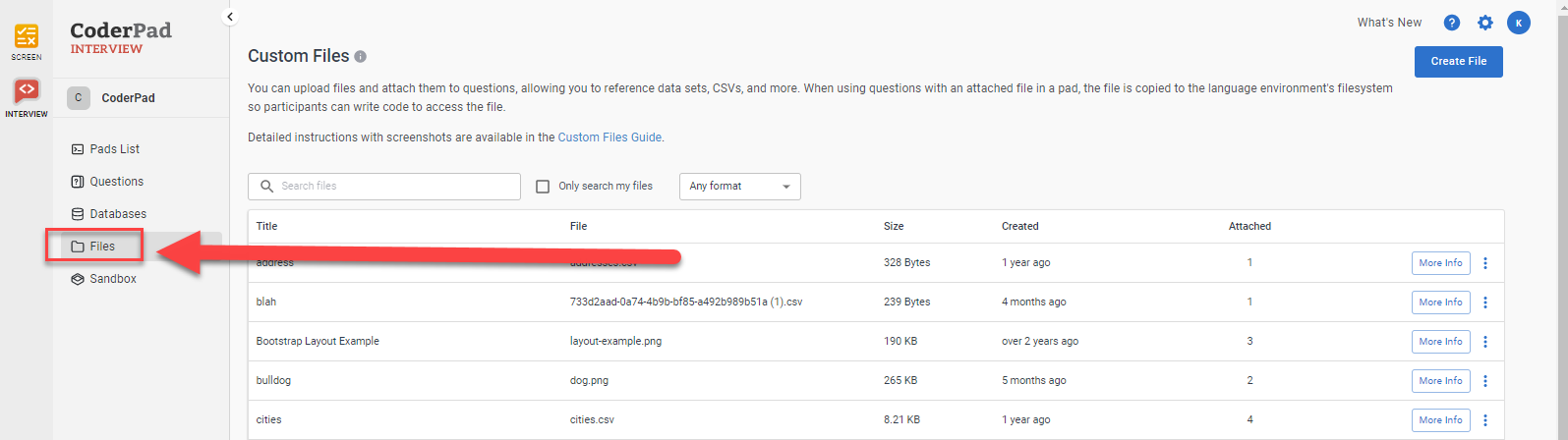To add a custom file for use in an interview question, first click Files in the left-side navigation bar of your dashboard.