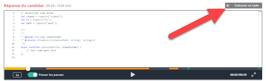 Cliquez sur Exécuter ce code pour exécuter le code du candidat à tout moment.