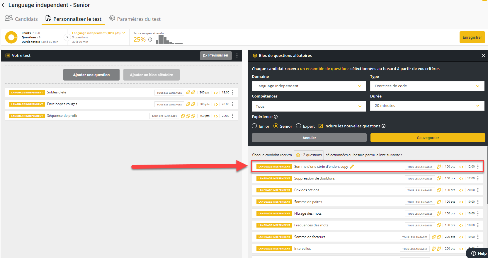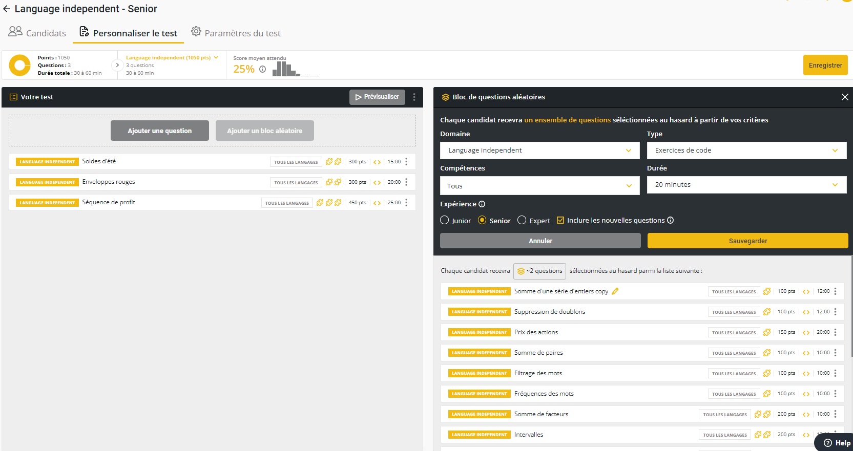 Votre test sera généré avec les questions que vous avez sélectionnées. Vous accédez ensuite à la fenêtre de personnalisation du test, où vous pouvez ajouter des questions, ajouter un contenu aléatoire, mettre à jour les paramètres du test, ou envoyer le test aux candidats.
