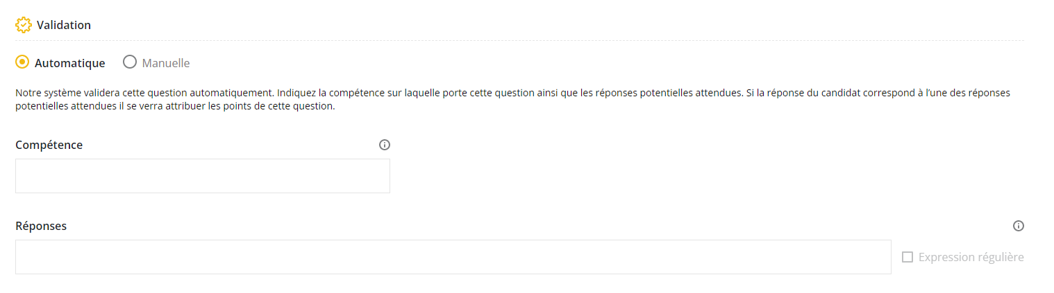 Sélectionnez la compétence et saisissez la réponse à la question. Les réponses des candidats doivent correspondre exactement, mais ne sont pas sensibles à la casse.