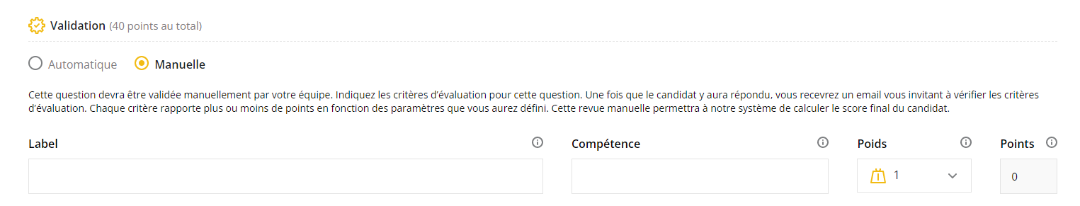 Lorsqu'un candidat a terminé un test dont la question nécessite une validation manuelle, vous recevez un courriel vous invitant à valider manuellement la réponse à la question. Le système calcule ensuite un score final.