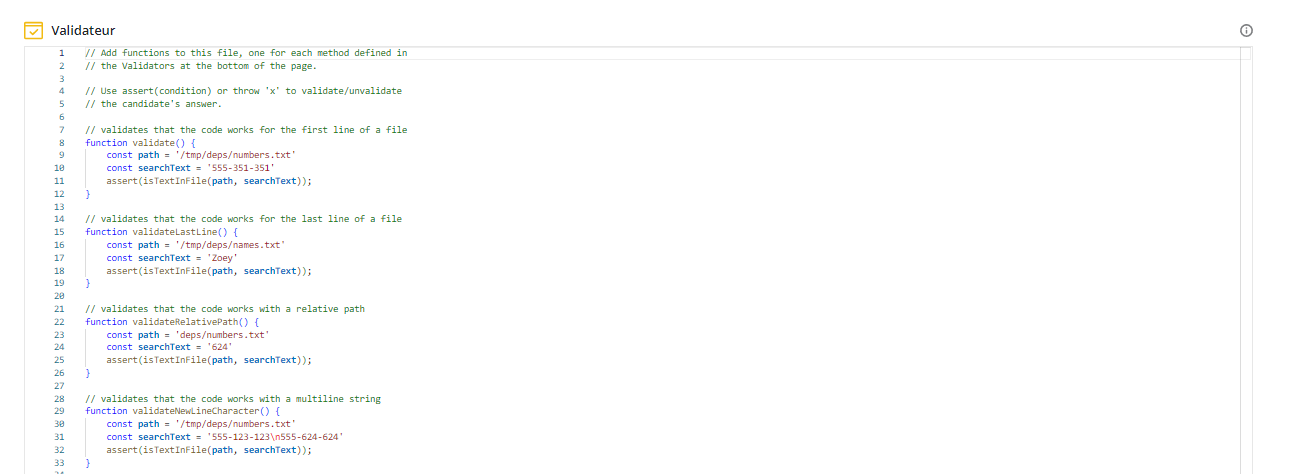 La section Valideur de code contient le code de validation qui s'exécute sur la solution du candidat afin de l'évaluer.
