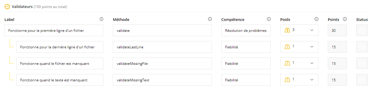 ℹ️ La raison de l'utilisation de cette logique parent/enfant est que vous pouvez vouloir tester des cas limites spécifiques (par exemple, input is null), mais vous ne voulez pas attribuer de points si le candidat a uniquement mis en œuvre les cas limites (if input is null then x).