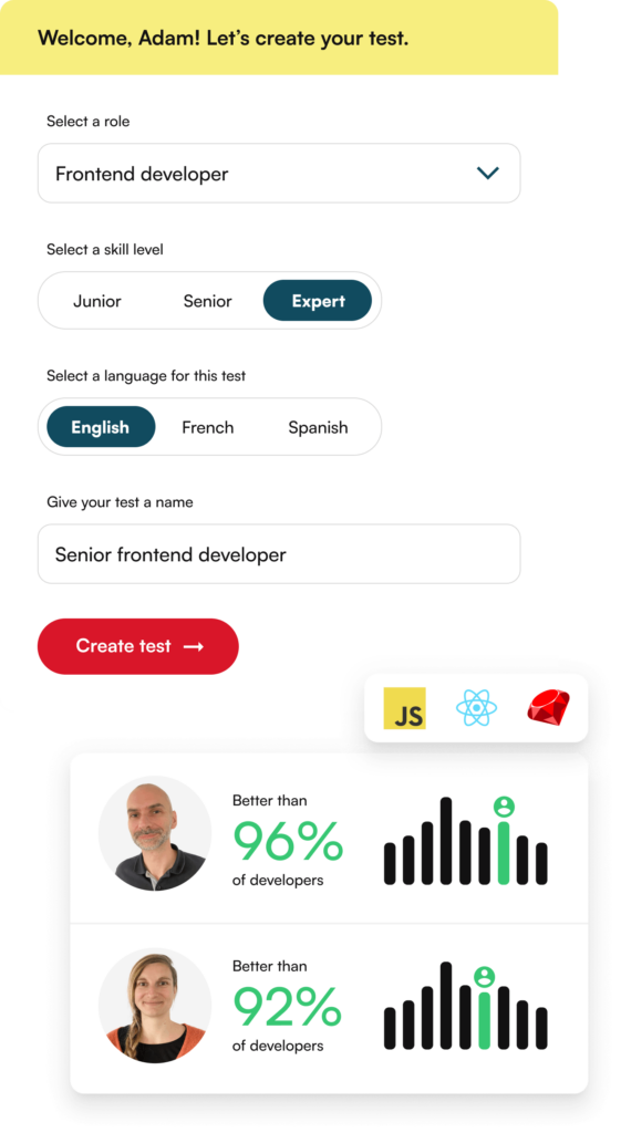 Generate well-balanced tests across multiple roles, languages, and skills–no technical setup required.