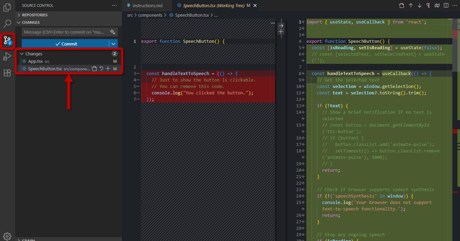 - Naviguer vers l'icône de contrôle de la source pour voir toutes les modifications apportées pendant l'évaluation.