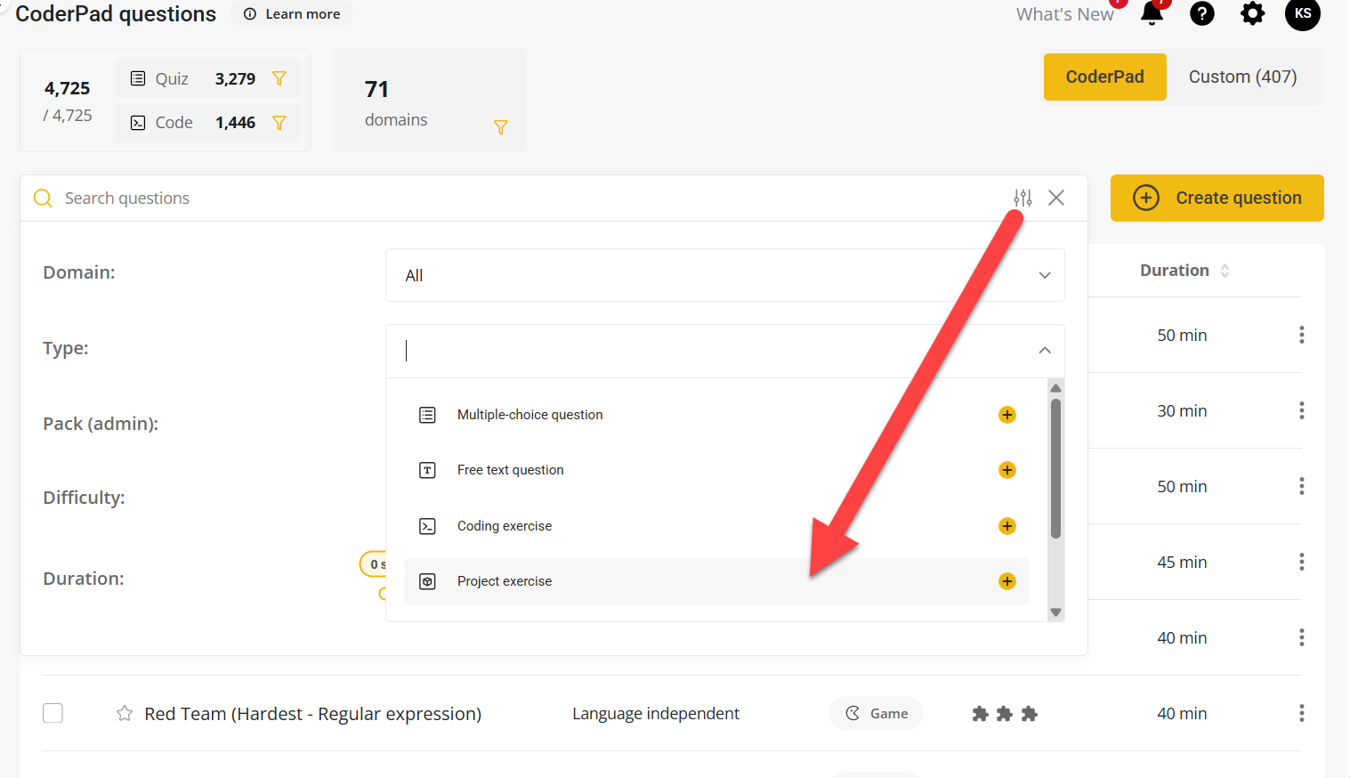 - Utilisez le menu déroulant du filtre pour sélectionner Exercice du projet comme type de question