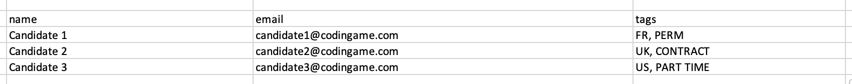 Configurez votre CSV de la manière suivante : les balises reflètent le lieu, le type de contrat ou toute autre information importante sur les candidats.