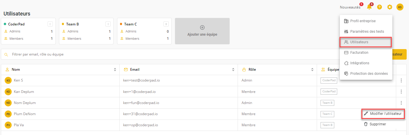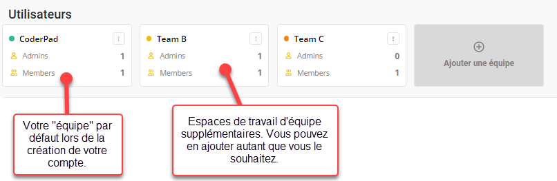 Les utilisateurs (administrateurs et membres) peuvent appartenir à une ou plusieurs équipes. Chaque test, pad et question personnalisée appartient à une équipe spécifique. Par conséquent, si vous appartenez à l'équipe A, vous verrez les tests et les pads de l'équipe A et vous pourrez modifier les questions personnalisées de l'équipe A. Vous pourrez toujours voir et utiliser les questions personnalisées des autres équipes, mais vous ne pourrez pas les modifier.