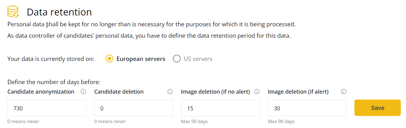 L'option Conservation des donées vous permet de définir la fréquence à laquelle vous souhaitez anonymiser ou supprimer les informations de vos candidats.
