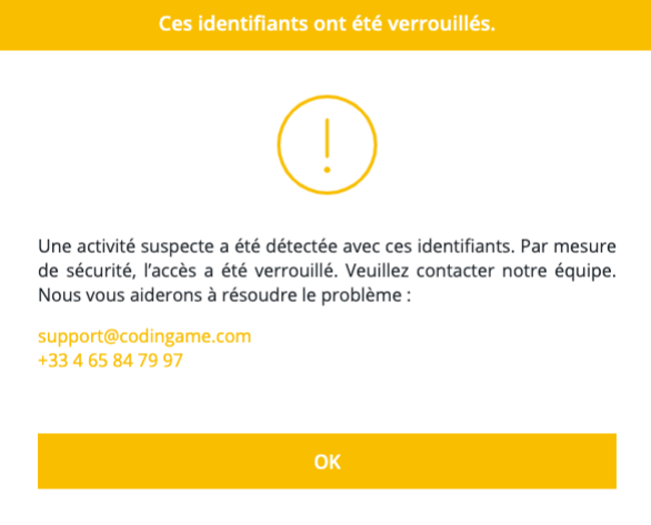Si vous êtes connecté à votre compte et qu'un autre utilisateur tente simultanément d'accéder à notre plateforme en utilisant vos informations d'identification, vous serez automatiquement déconnecté. Cela déclenchera l'alerte indiquée ci-dessus et verrouillera votre compte.