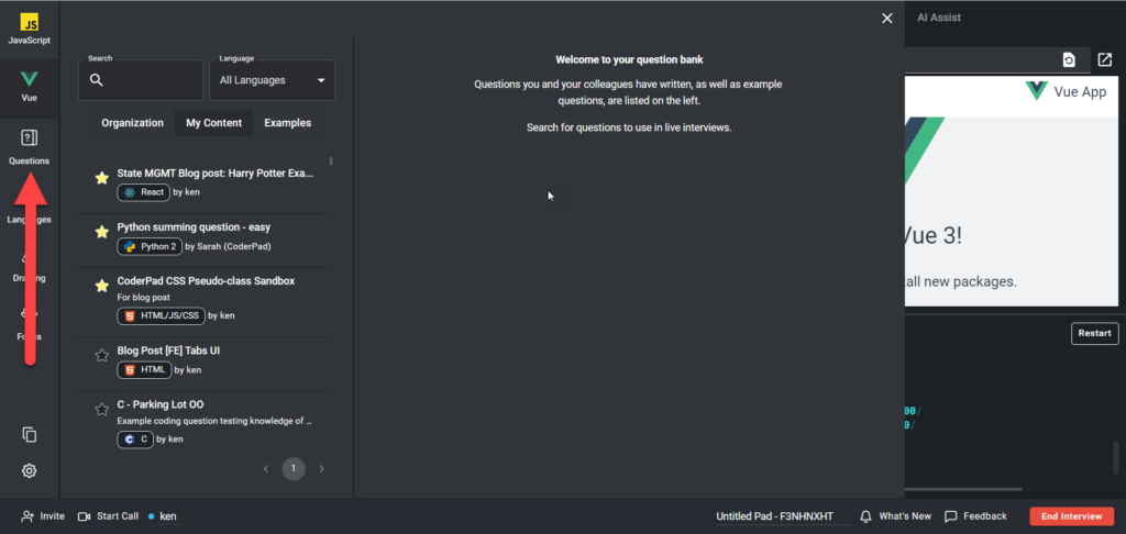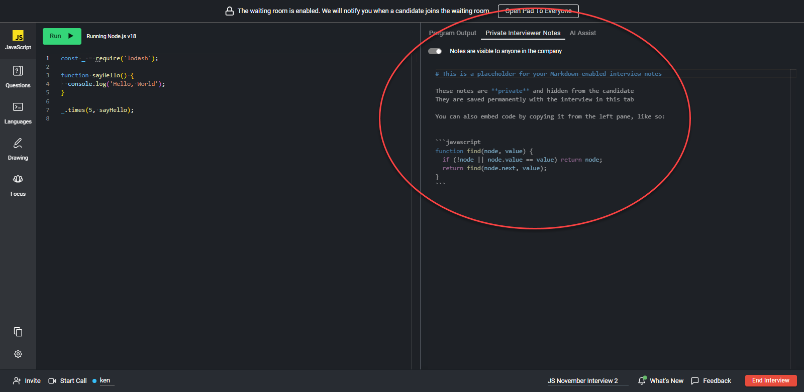 Vous n'aurez pas accès à la lecture des entretiens en direct tant que vous n'aurez pas appuyé sur le bouton Fin d'entretien. Le fait de laisser le pad ouvert signifie également que le candidat peut y accéder et continuer à modifier son code même après la fin de l'entretien.