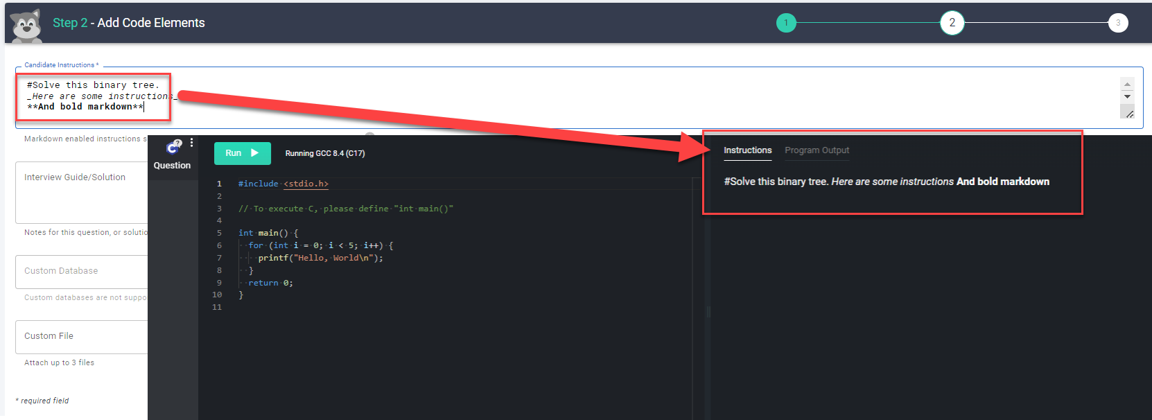 ✅ Notez qu'Interview ne prend pas actuellement en charge la création de questions personnalisées en plusieurs langues, mais nous prenons en charge les questions agnostiques en termes de langue. Utiliser les Instructions du candidat et définir la langue de la question par défaut sur "Texte brut" comme mentionné ci-dessus est la meilleure façon de créer des questions agnostiques de langue.