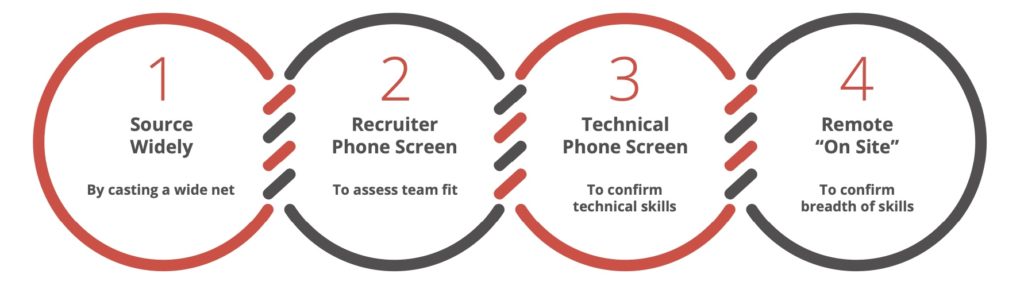 Once your candidate has passed the initial take-home project, they’re ready for the Recruiter Phone Screen. This step is about confirming technical experience, which is critical in the overall hiring funnel. This is the time in the interview process where you must ensure the candidate and employer are aligned. That checklist includes: