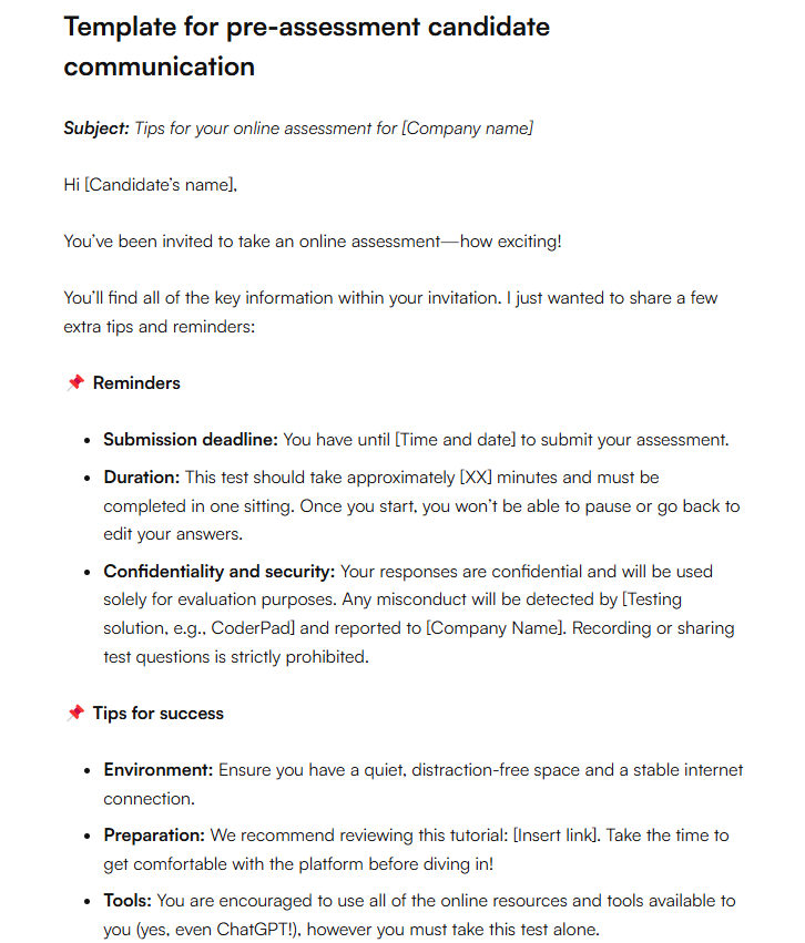 AI blurs the line between authorized and unauthorized resources. Be clear about what tools candidates can use during assessments, and design tests that evaluate their ability to use those tools responsibly and effectively.
