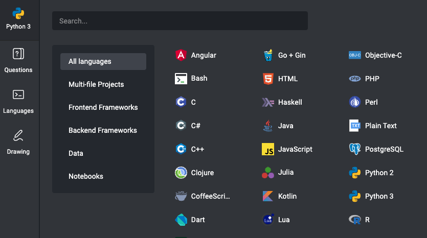 We’re doing a light UI update of the in-pad language selection menu, to make it easier to navigate our growing list of languages, frameworks, and notebooks. We’ve already added a search bar, and the new categories filter will make it easier to filter and find the right language category for your interviews.