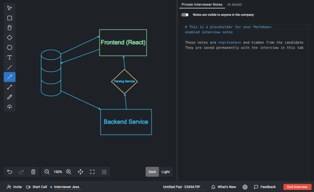 Want to talk through a system architecture or design problem? Or show how databases are connected and work together? Get ready for a whole new digital whiteboard experience! In addition to the recent UI overhaul, soon you will be able to spin up a dedicated Drawing Mode pad with an image already uploaded for you to work on with a candidate.