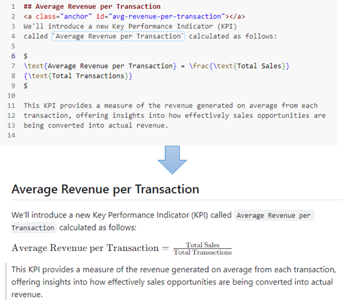 <a class="anchor" id="avg-revenue-per-transaction"></a>is an HTML tag used to create a hyperlink anchor for more straightforward navigation within the Notebook. - Math equations: The formula for the KPI is displayed using LaTeX notation enclosed within dollar signs