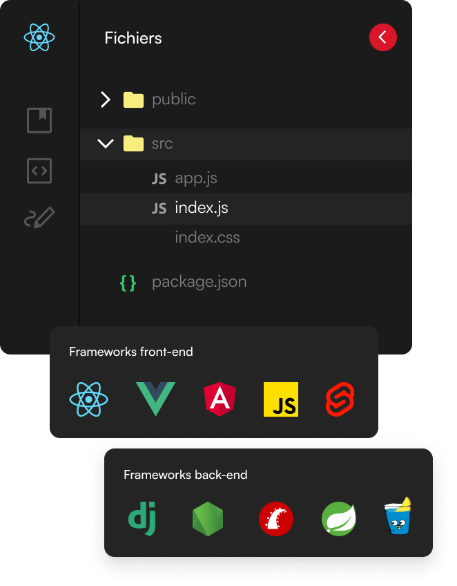 Un IDE familier qui couvre les langages et frameworks indispensables pour recréer n’importe quel défi ou projet.