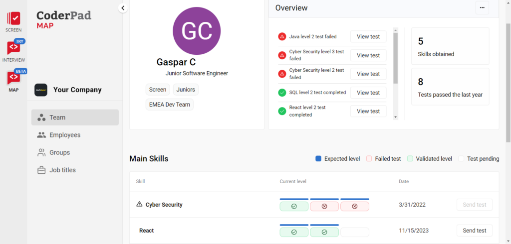 If you’d rather not dedicate the time to manually collecting employees’ skill sets and levels and creating your own convoluted ECM, you can use CoderPad Map instead.