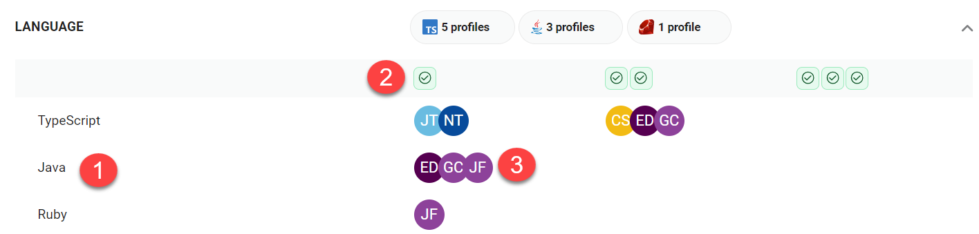 Generally, you’ll want to ensure you’re covering skill sets to cover a particular job role. For example, a full-stack developer might need to be competent in Angular, Node.js, and Postgres, while your DevOps engineer may need Azure, AWS, and Docker knowledge.