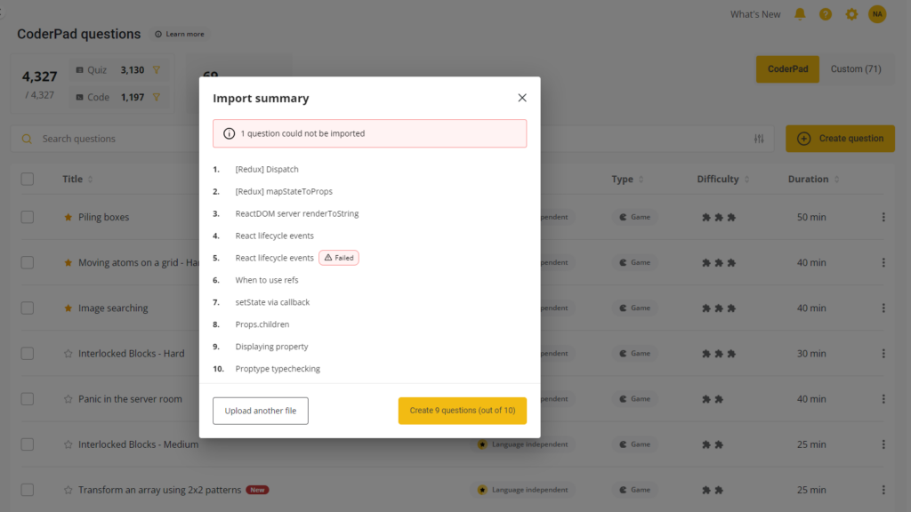 It’s now even quicker to find the language or framework you need in Interview and you can easily bulk upload custom questions to Screen, favorite questions to find easily, or enjoy the new gamified questions we’ve added to the bank.