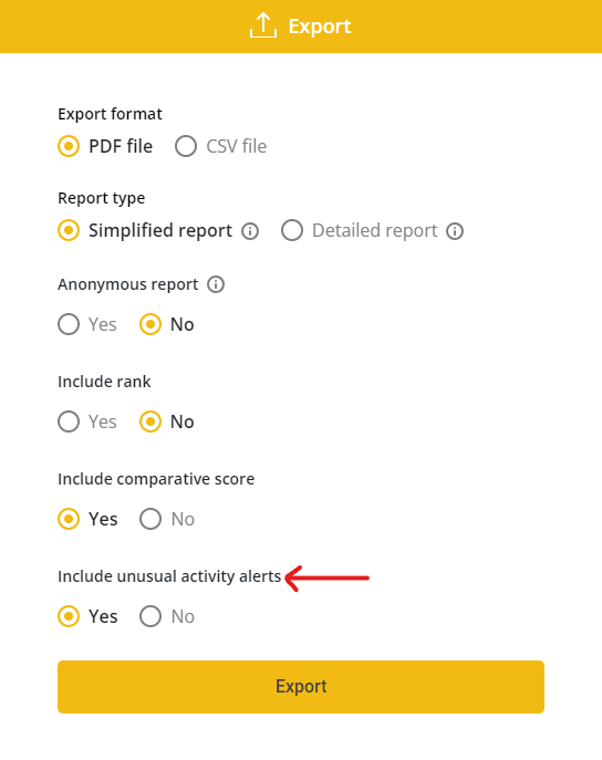 When exporting candidates’ reports, you can now choose whether to include unusual activity alerts in your report.