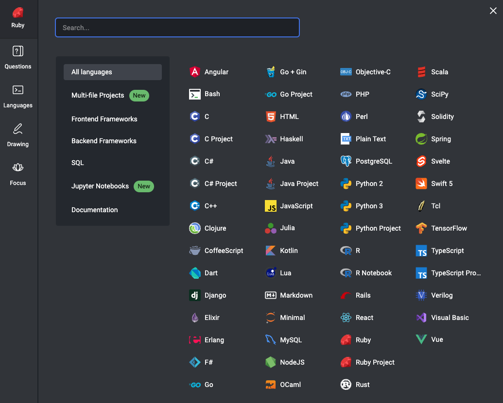 The number of available languages and frameworks keeps growing so we’ve redesigned the language menu so you can find what you’re looking for more quickly. Now you can browse the list, type the language you’re looking for in the search bar, or navigate by category.
