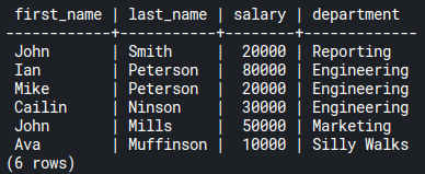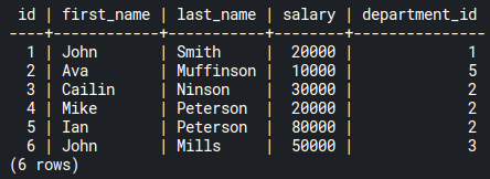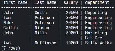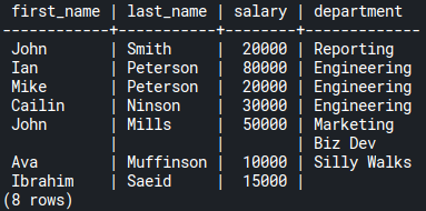 An employee table has been created for the example queries in this section. Have a look at the employees table first before proceeding: