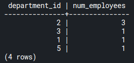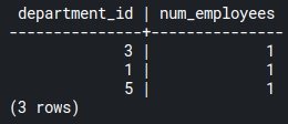 See another example where you want to get all departments where we have just a single employee. To do that, run this query: