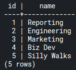 Have a second look at the departments table, and you’ll see that there is a department that has no employees, which is Biz Dev, with an id of 4. That’s because department_id has no value of 4 in the employees table.