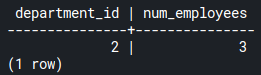From the image above, the engineering department id is 2. If you filter the department_id that equals 2 in the first query, you’ll get the number of employees in the engineering department:
