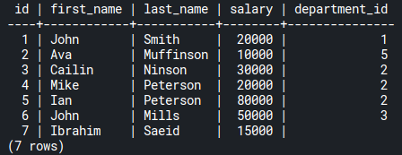 As you can see, Ibrahim Saied is added with a salary equal to 15000 but there was a little issue. He was not assigned to any department. In other words, the value of department_id in his record is NULL. Have a look at the new employees table running SELECT * FROM employees: