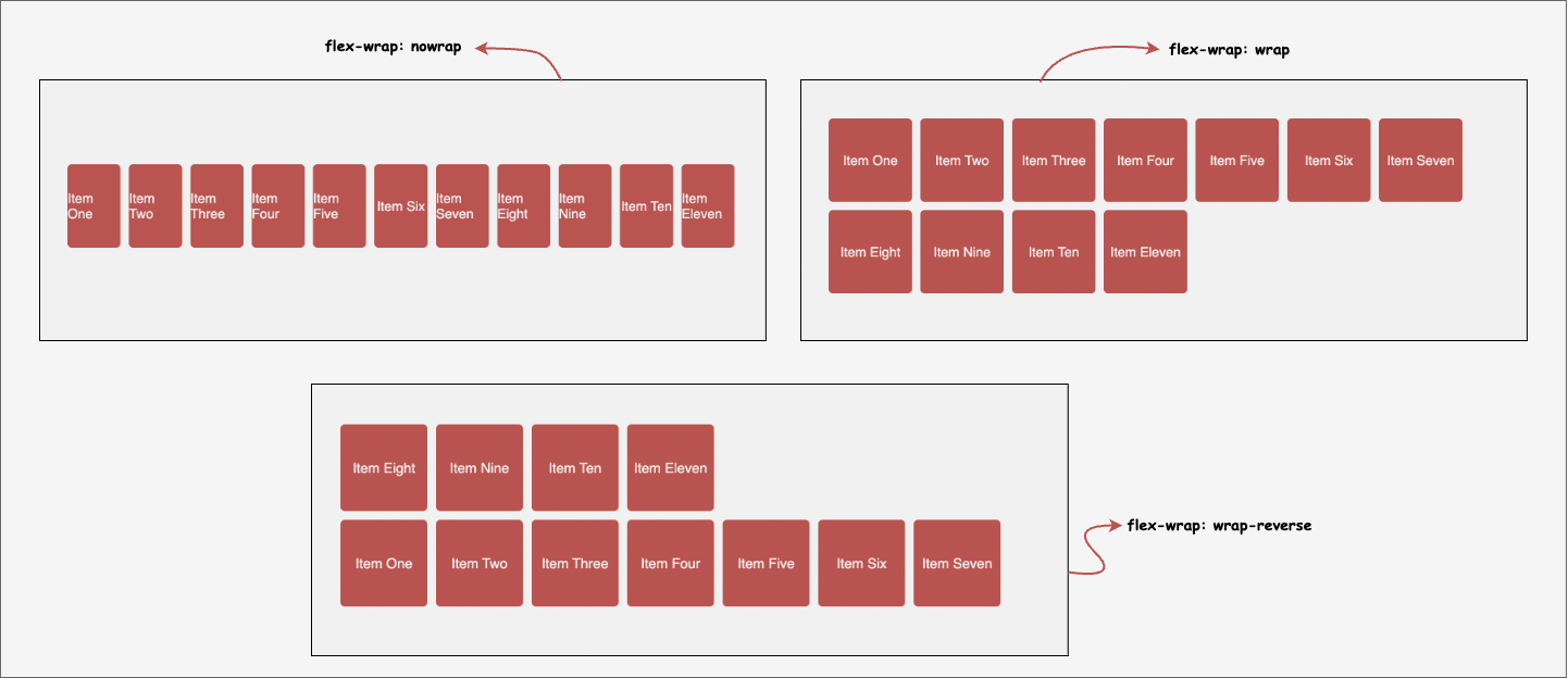 There are two other values, nowrap and wrap-reverse. wrap will help you wrap your items onto multiple lines, from top to bottom, rather than compressing all flex items to one line. While the default value of nowrap causes all flex items to shrink onto one line, wrap-reverse causes the flex items to wrap across multiple lines from bottom to top.