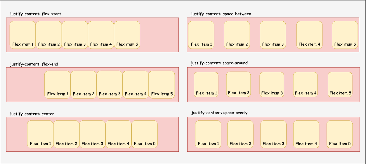 justify-content: flex-start | flex-end | center | space-between | space-around | space-evenly;