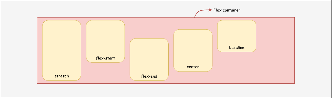 stretch: By default, flex items are stretched to fill the flex container, still respectingmin-widthandmax-widthproperties.flex-start: This places all flex items at the start of the cross-axis based on theflex-direction. Other values similar to this arestartandself-start.flex-end: This is the opposite offlex-start, as flex items are placed at the end of the cross-axis. Other values similar to this areendandself-end.center: This places flex items in the center along the cross-axis.baseline: All flex items are aligned in the sense that their baselines are aligned.