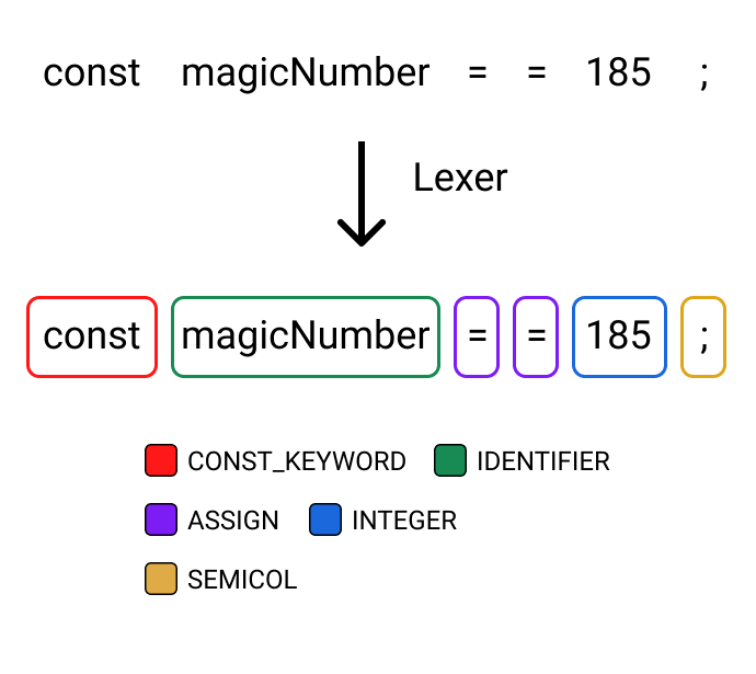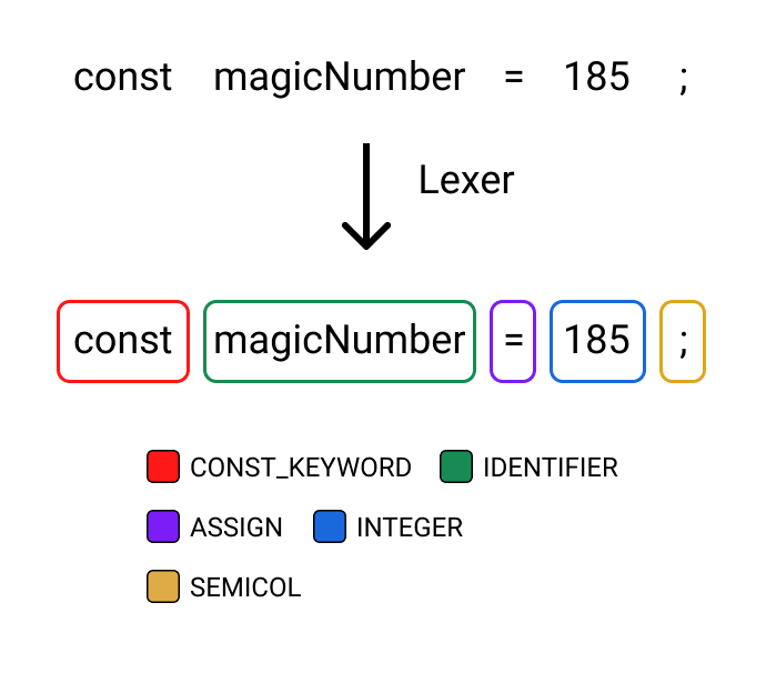 [CONSTANT_KEYWORD, IDENTIFIER, ASSIGN, INTEGER, SEMICOL]Code language: JavaScript (javascript)