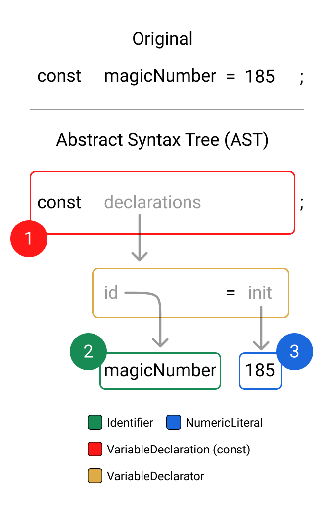 The AST takes the tokens and adds in further context to fully understand what your code is attempting to say. E.g., our magicNumber example might be turned into a structure similar to the following:
