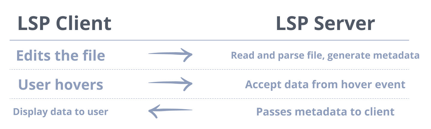 For example, say the user wants to see the TypeScript definition for a variable they see. When they hover over the variable, it sends a request to the LSP server, including a bit of information to fulfill the request.