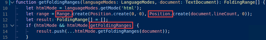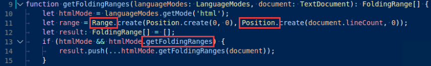 Notice how the parameters that are passed in are highlighted the same color. Likewise, Range and Position are both acknowledged as classes, while getFoldingRanges is presented as a function, even when used as a parameter.