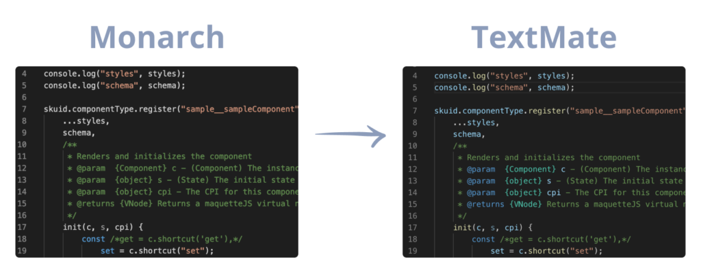 Notice how most of the semantic value is lost in Monarch. TextMate, on the other hand, is able to showcase that console is an object with a method of log.
